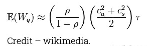 我知道它長得有點可怕,不過我們不需要知道每個符號的意義也可以運用這個公式。只要知道公式最左邊的 E(Wq) 代表等待時間的期望值,而 ρ 代表「稼動率」就行了(可以想像成工作負荷量)